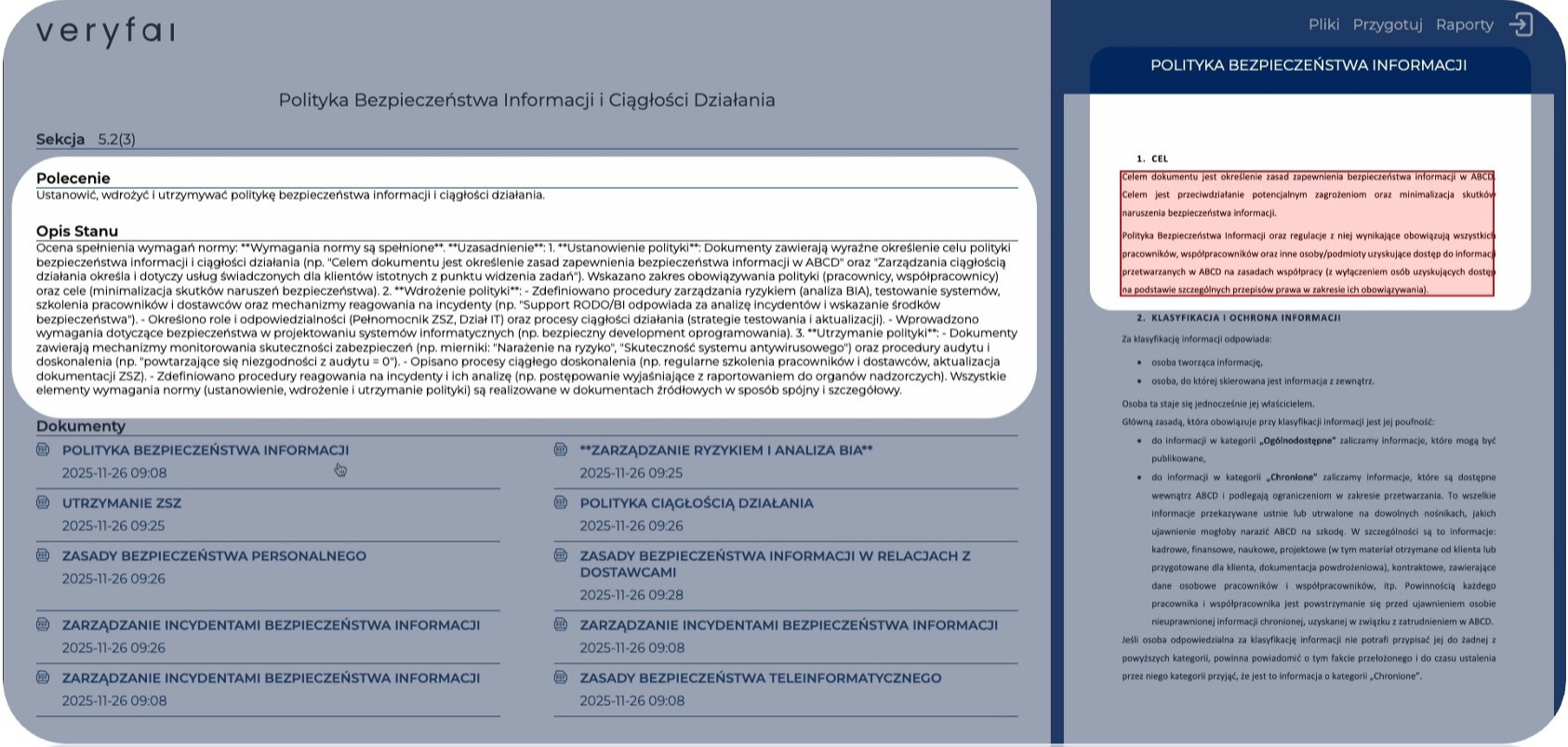 VERYFai zapewnia precyzyjne wyszukiwanie zapisów oraz bezpośrednie odniesienia do konkretnych punktów norm i regulacji. Każda odpowiedź opiera się na zweryfikowanych treściach dokumentów, z uwzględnieniem kontekstu funkcjonowania organizacji, co wspiera świadome i odpowiedzialne decyzje.